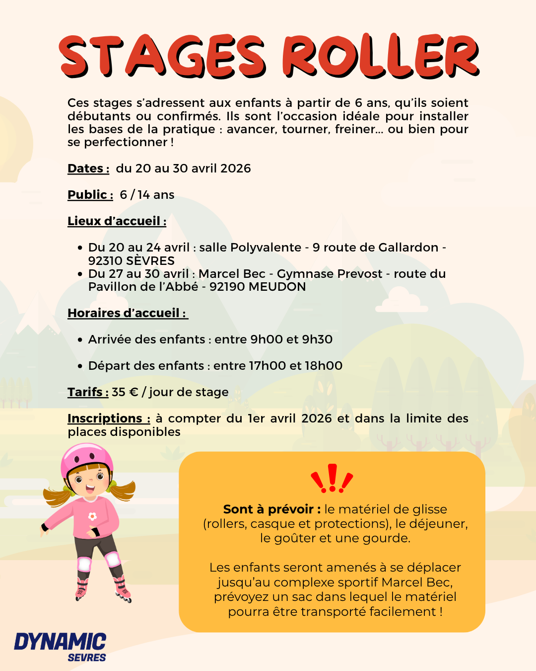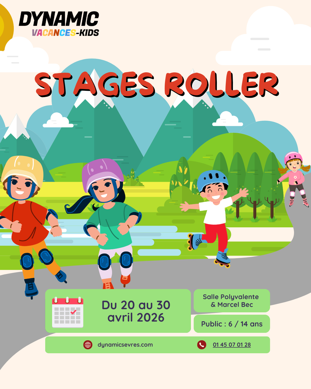 - Stages Roller, pour les 6-14 ans (enfants nés de 2011 à 2019) – du 20 au 30 avril 2026 (hors week-end), inscription à la journée.