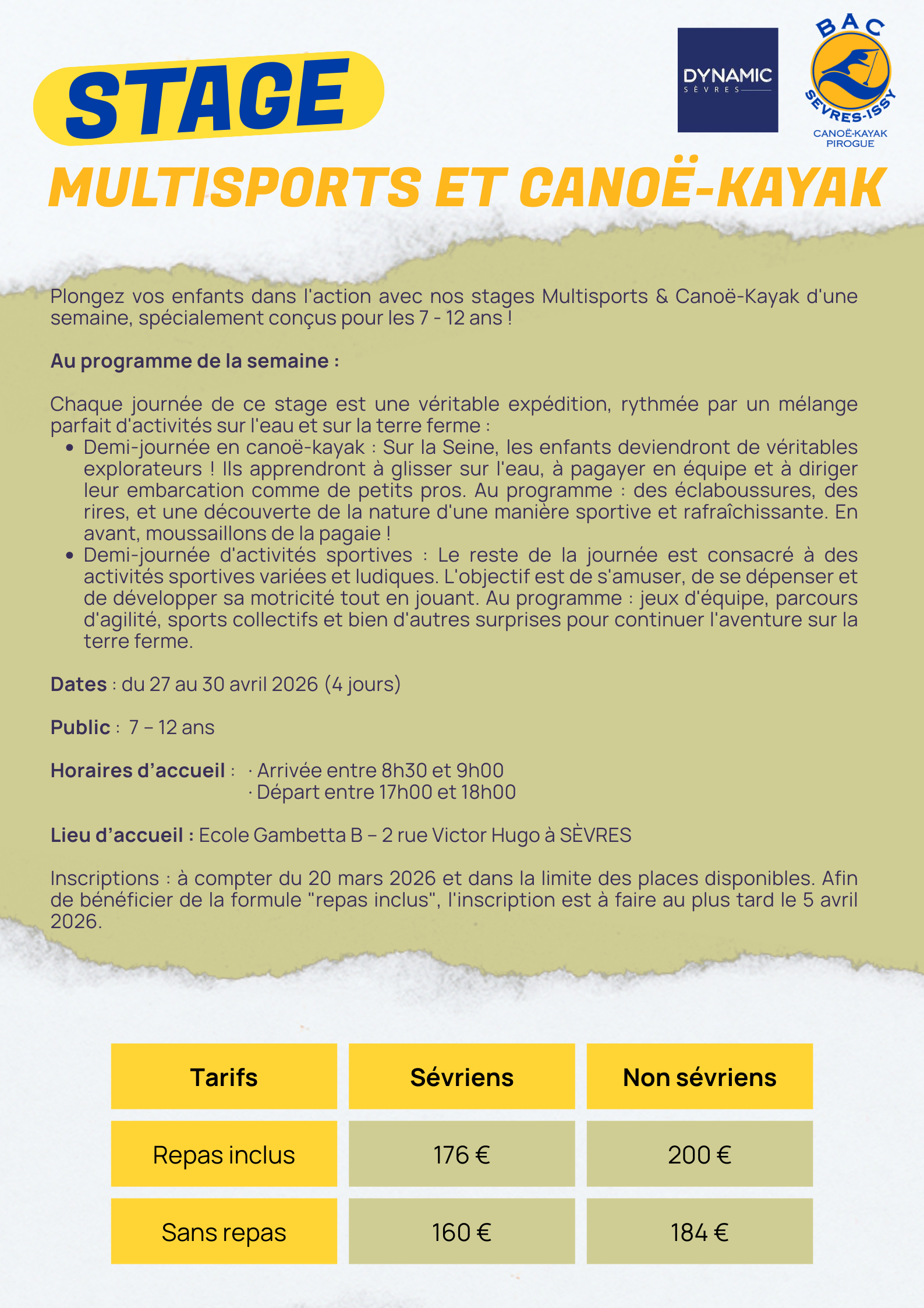 - Stages Sport et Canoé-Kayak, pour les 7-12 ans (enfants nés de 2013 à 2018) – du 27 au 30 avril 2026 (4 jours), inscription à la semaine.