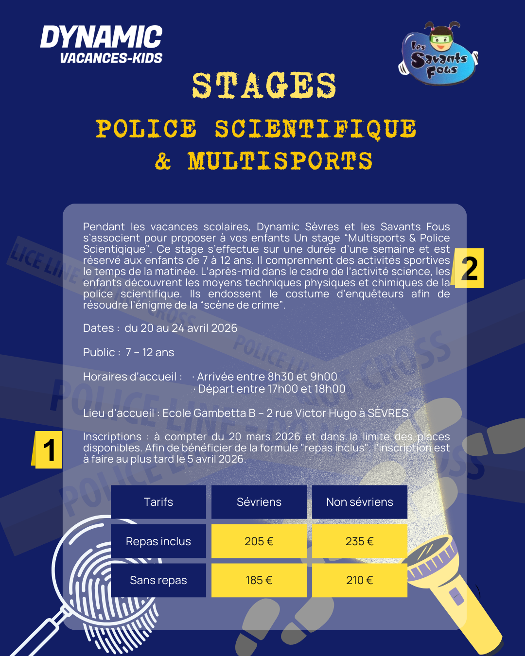 - Stages Sport et Police scientifique, pour les 7-12 ans (enfants nés de 2013 à 2018) – du 20 au 24 avril 2026, inscription à la semaine.