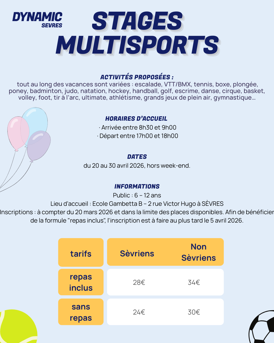 - Journées multisports, pour les 6-12 ans (enfants nés de 2013 à 2019) – du 20 au 30 avril 2026 (hors week-end), inscription à la journée.