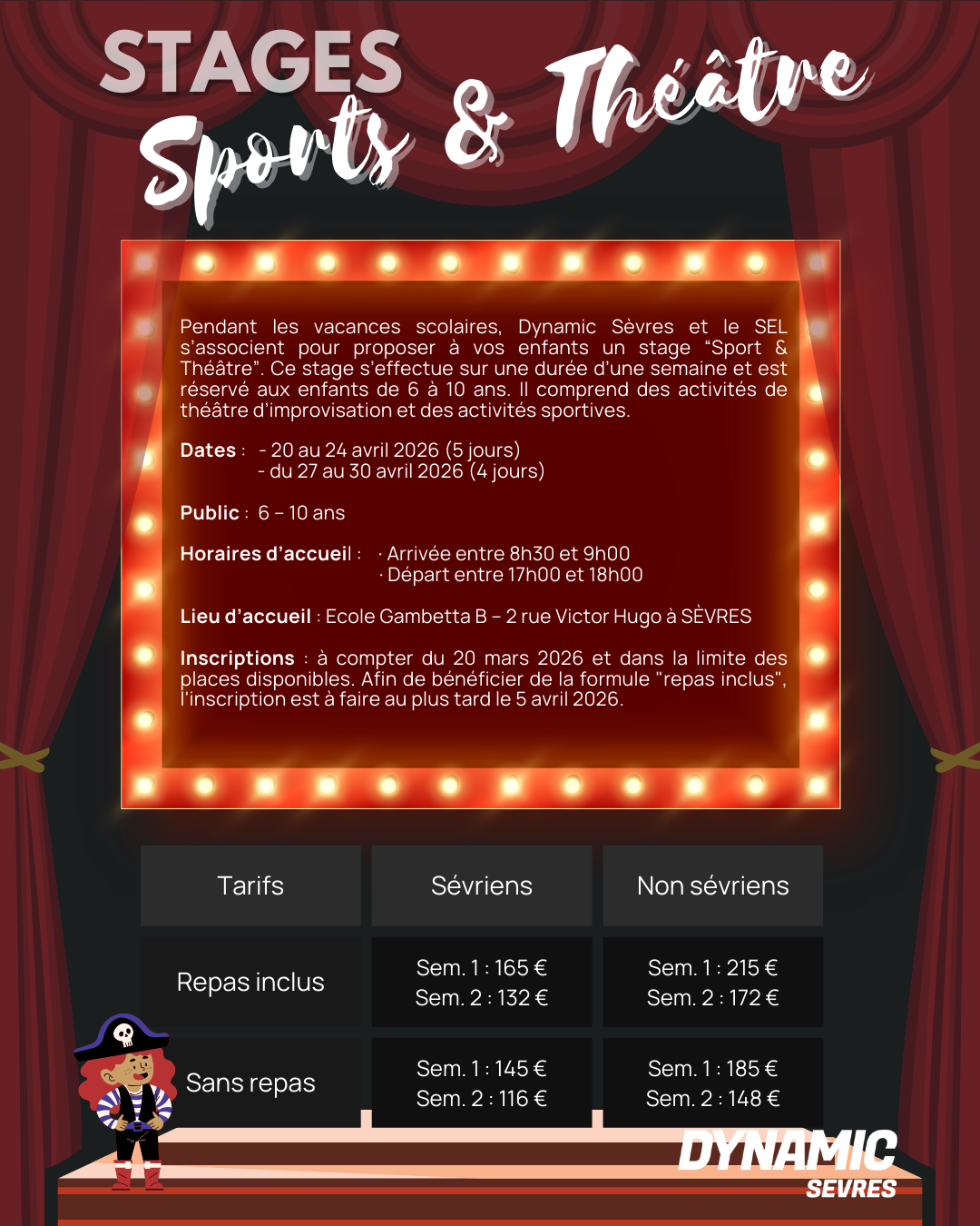 - Stages Sport & Théâtre, pour les 6-10 ans (enfants nés de 2015 à 2019) – du 20 au 24 avril 2026 (stage de 5 jours) et du 27 au 30 avril 2026 (stage de 4 jours), inscription à la semaine.