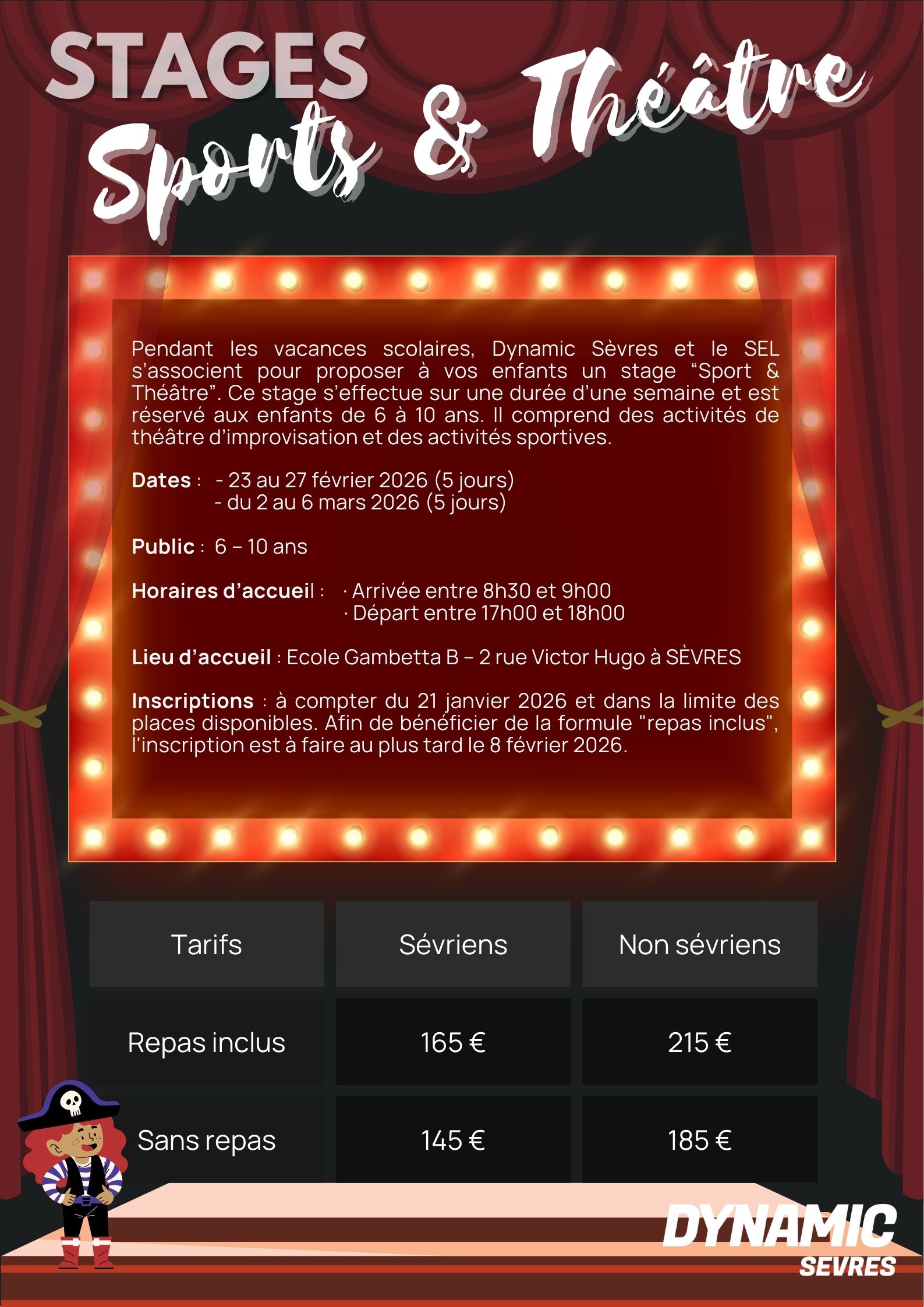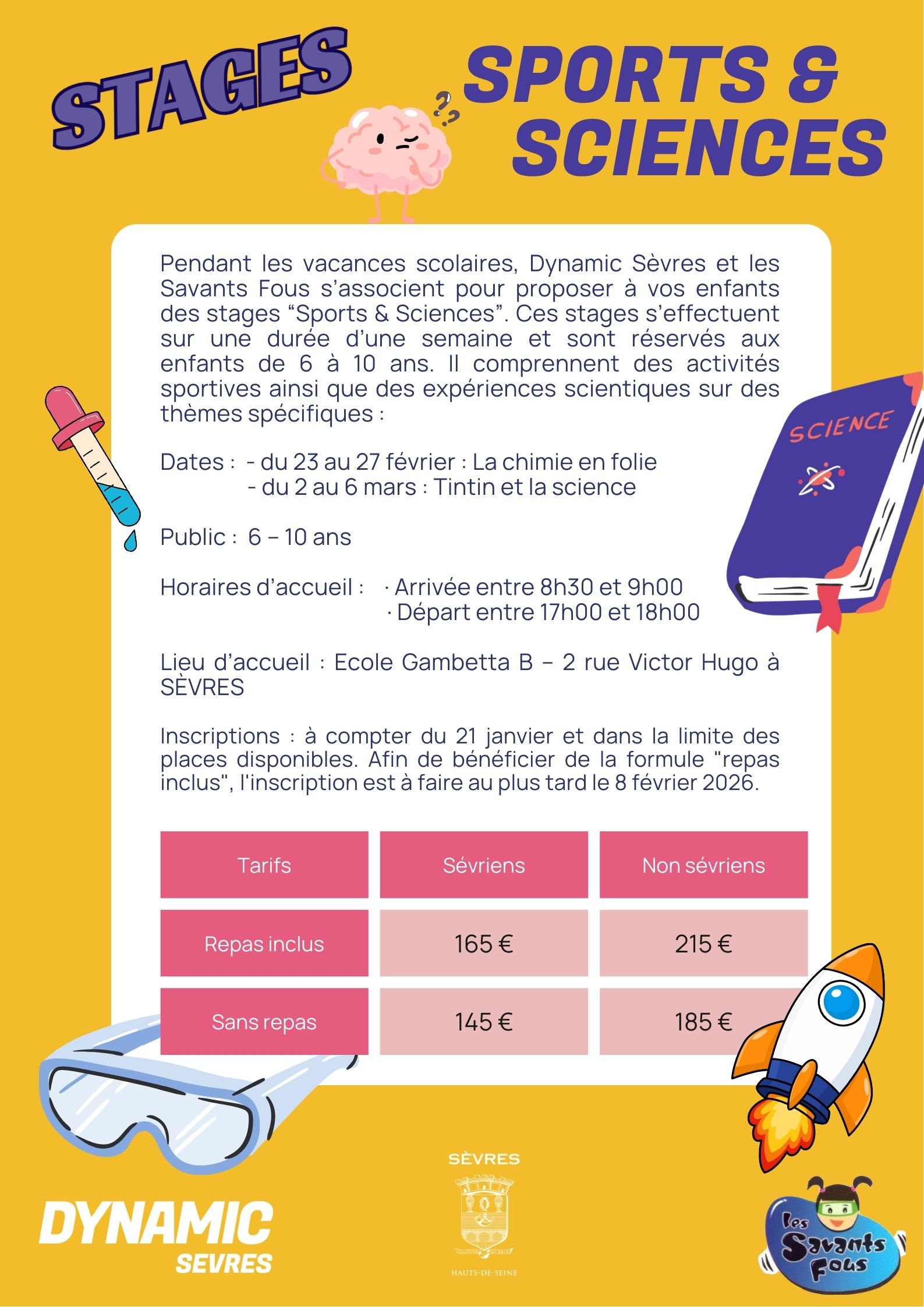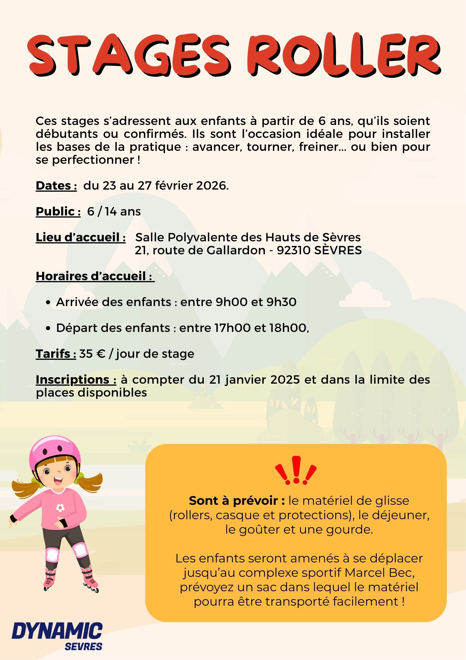 Pour tous les stages : Les inscriptions commencent le 21 janvier 2026. Effectuez l’inscription avant le 8 février pour pouvoir bénéficier du déjeuner et du goûter (hors stage de roller).